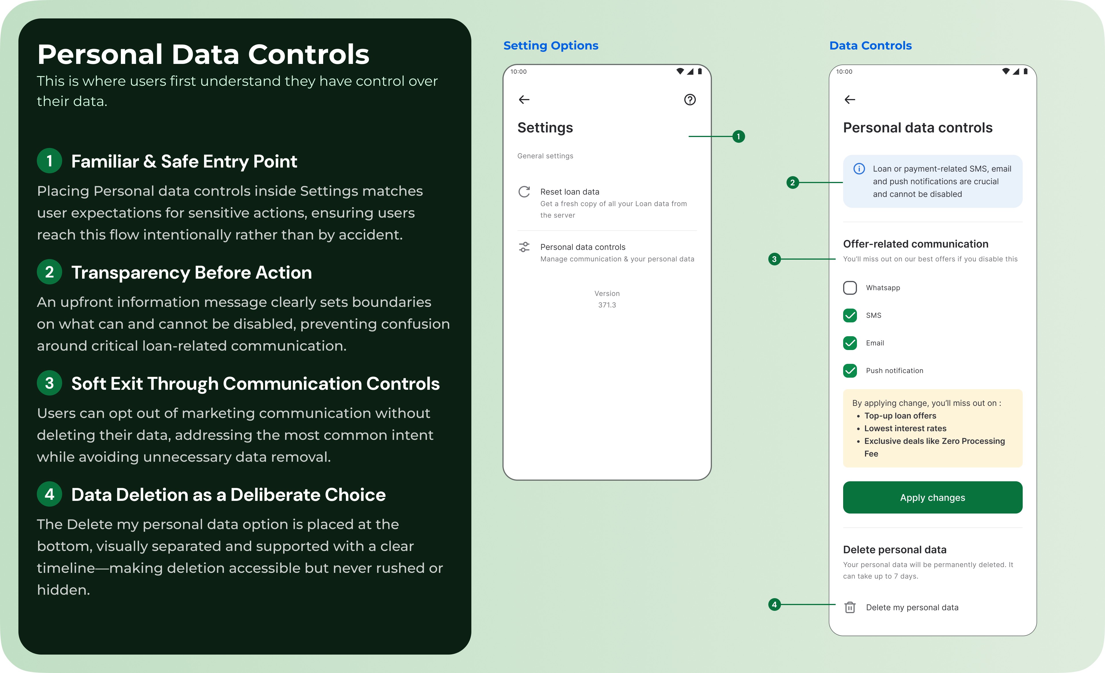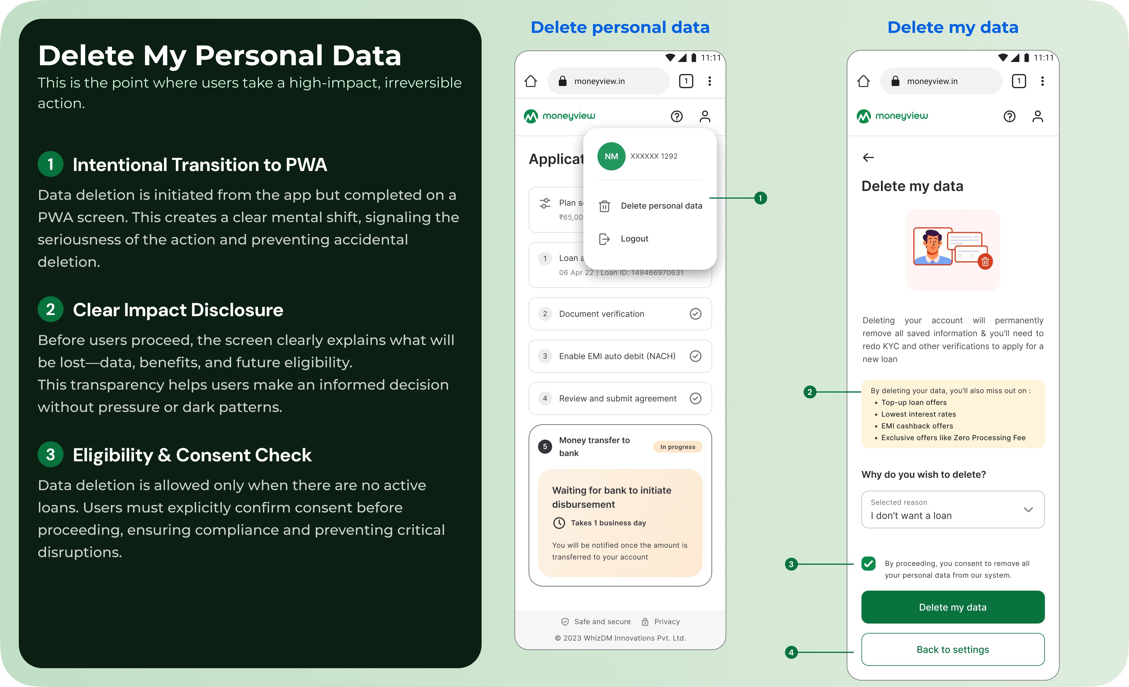 Users often feel anxious about their data lingering in apps after uninstallation, especially with financial applications where sensitive information is shared. New RBI regulations required a data deletion system, but the challenge was creating one that empowers users while maintaining business engagement.