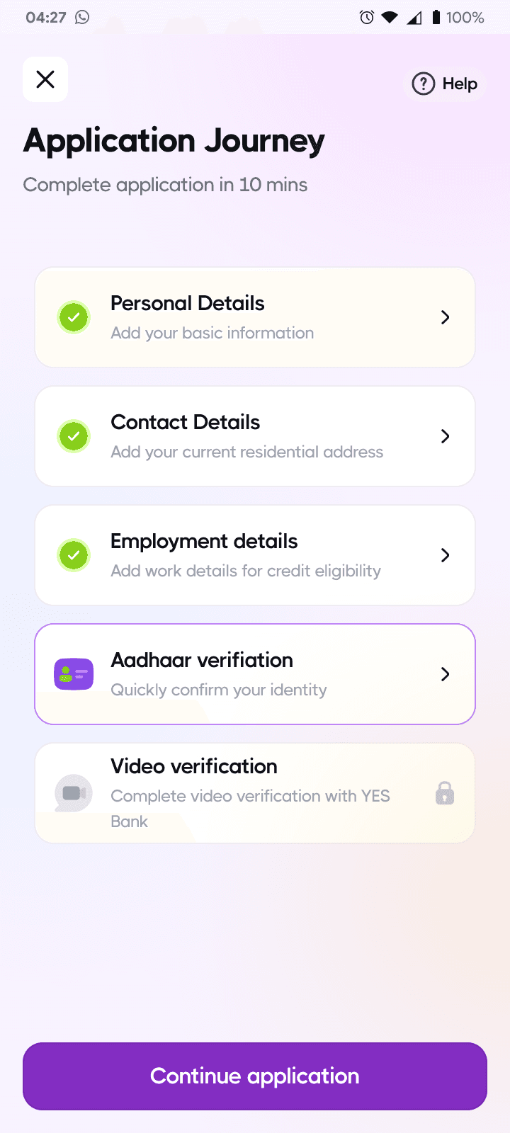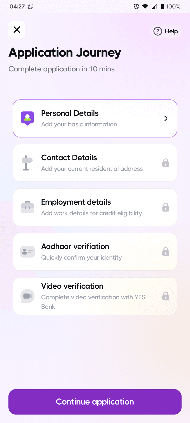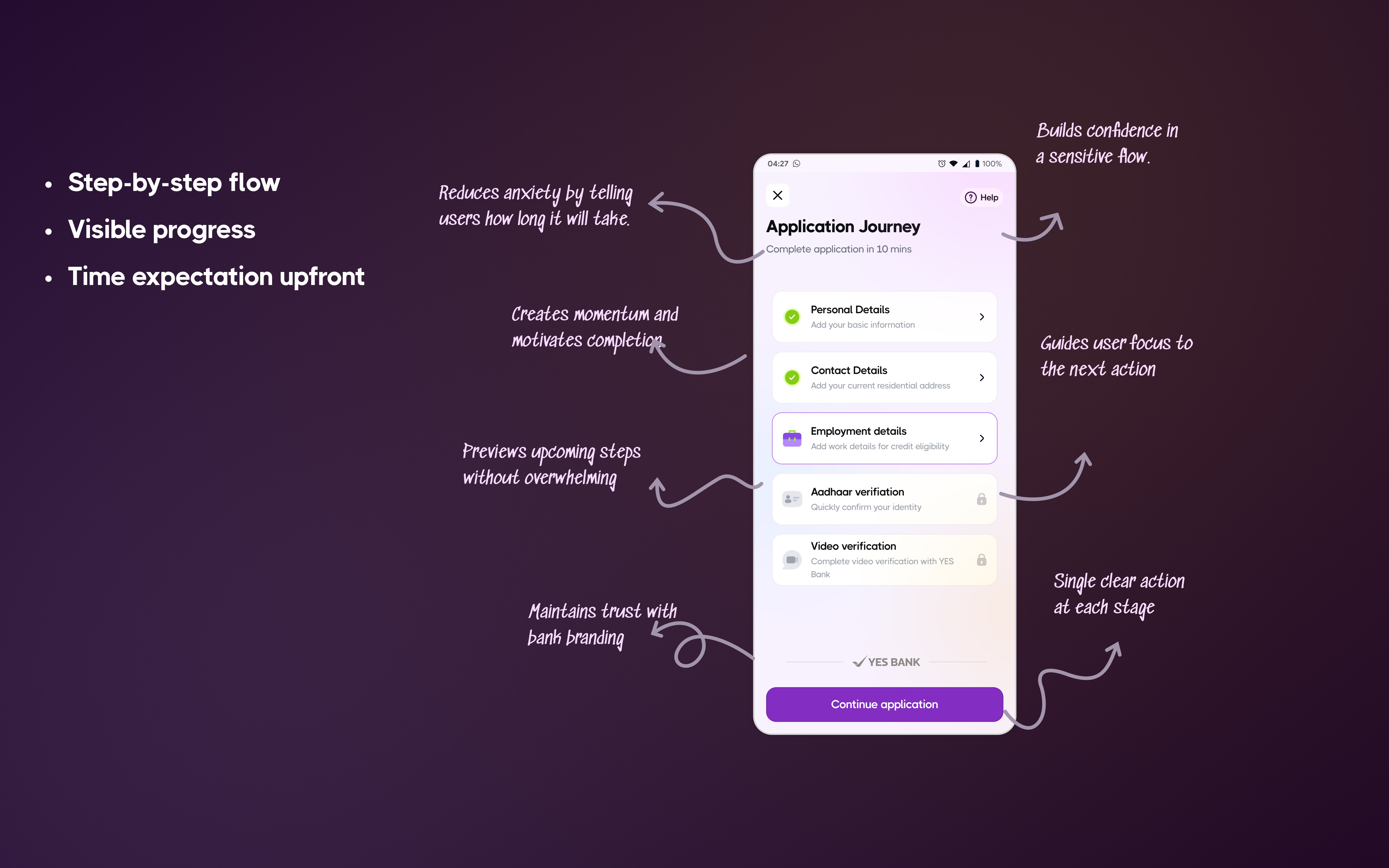 The journey starts with a step overview screen that clearly shows all application stages, current progress, and estimated time. This screen acts as a single source of truth, allowing users to understand where they are in the journey and safely resume from the same step if they exit and return.