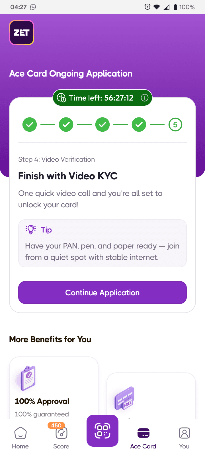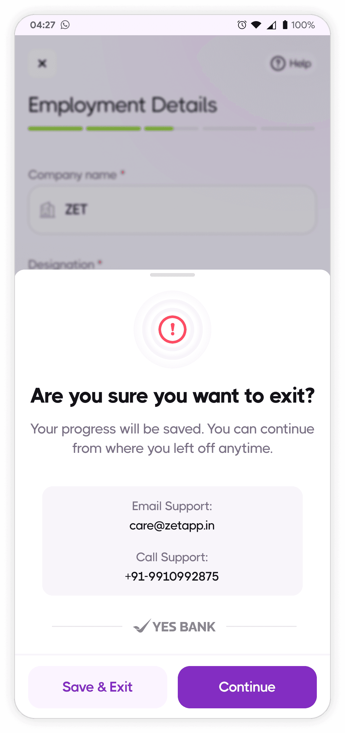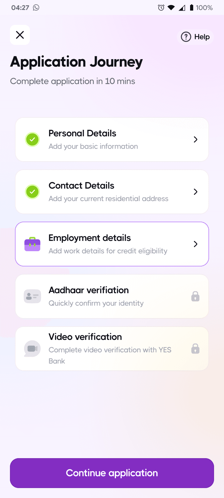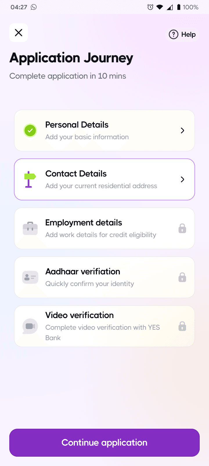 The journey starts with a step overview screen that clearly shows all application stages, current progress, and estimated time. This screen acts as a single source of truth, allowing users to understand where they are in the journey and safely resume from the same step if they exit and return.