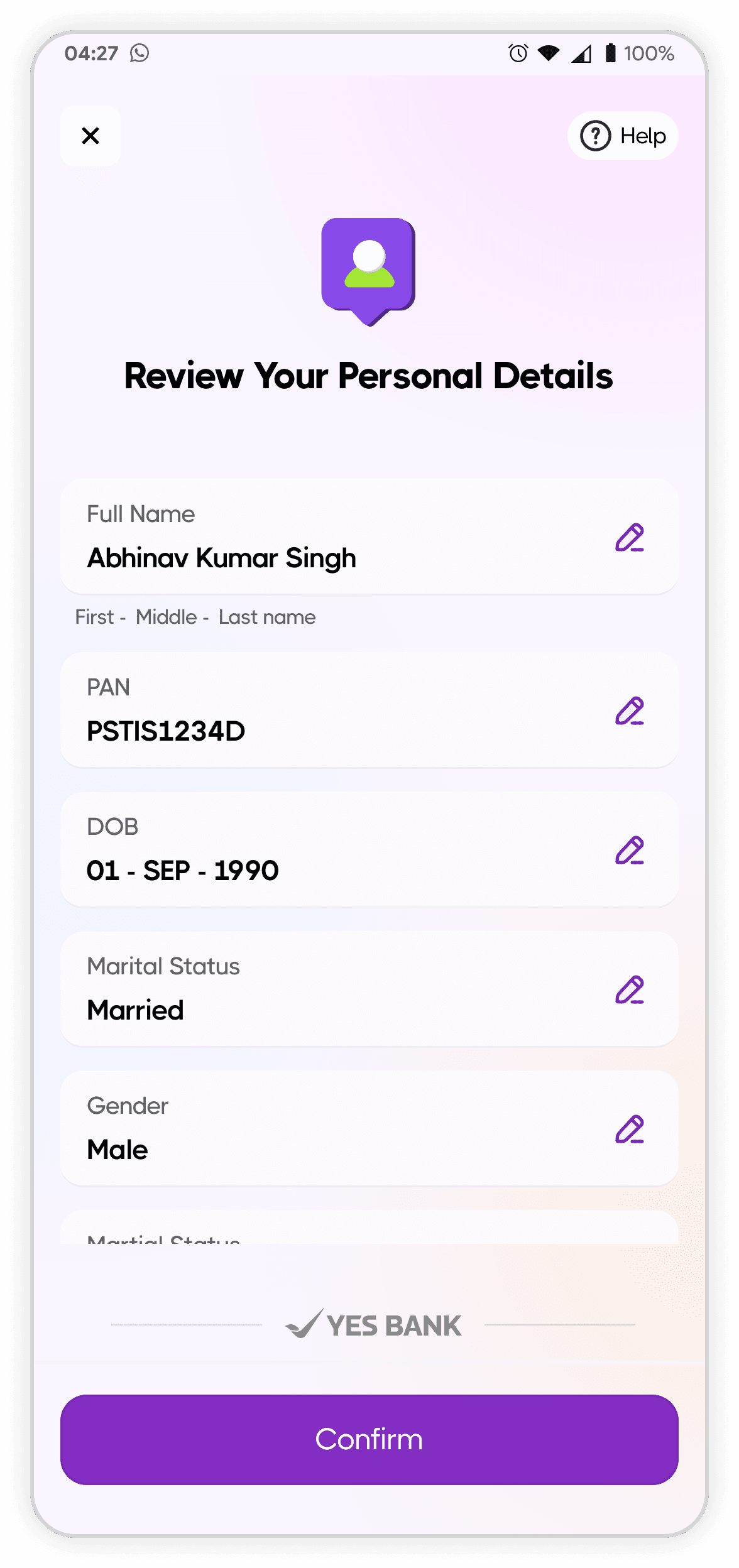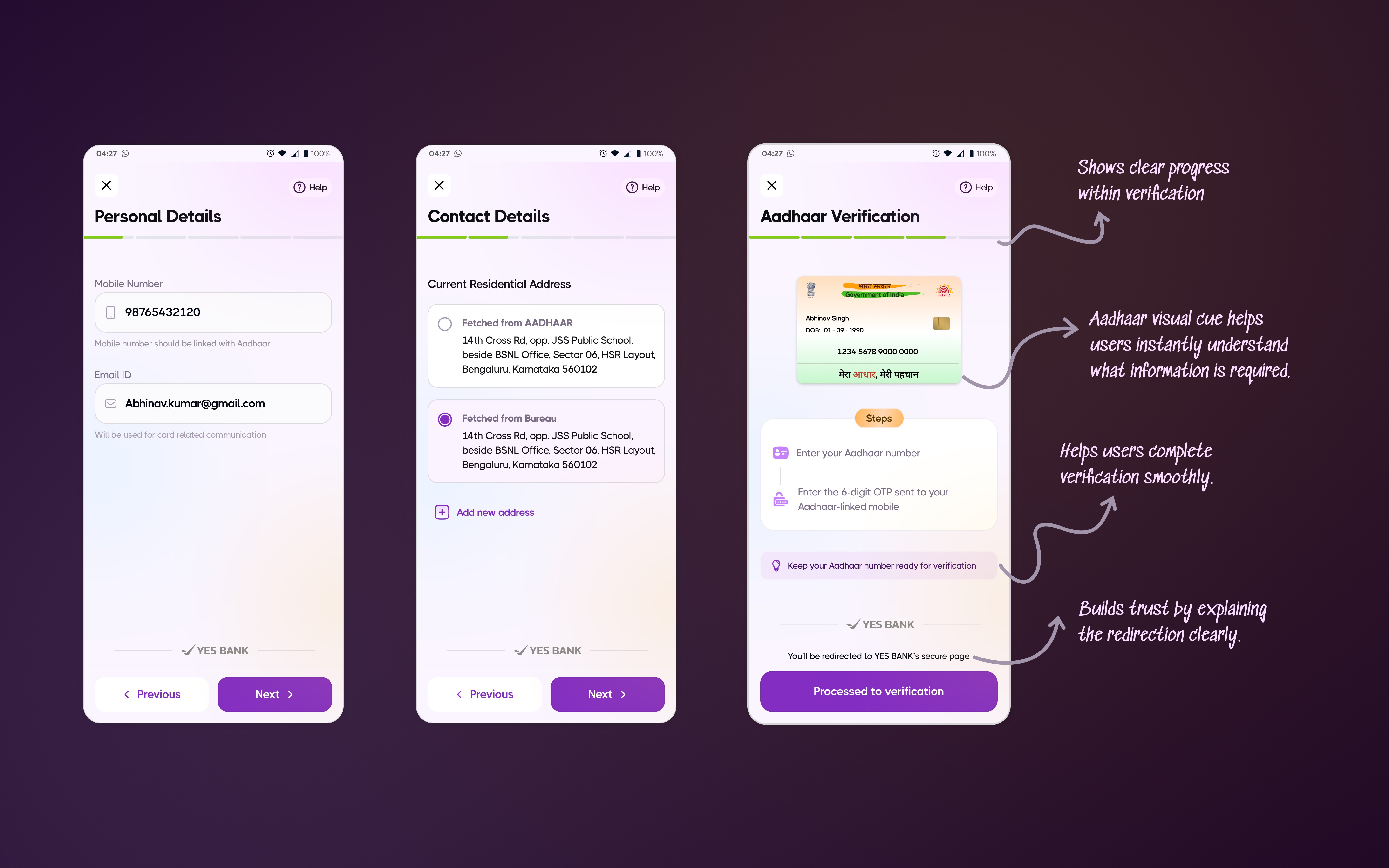Long forms were broken into smaller, grouped sections with fewer inputs per screen. Autofill and pre-fetched data were used where possible, while clear bank branding and redirection messaging helped users feel confident during sensitive verification steps.